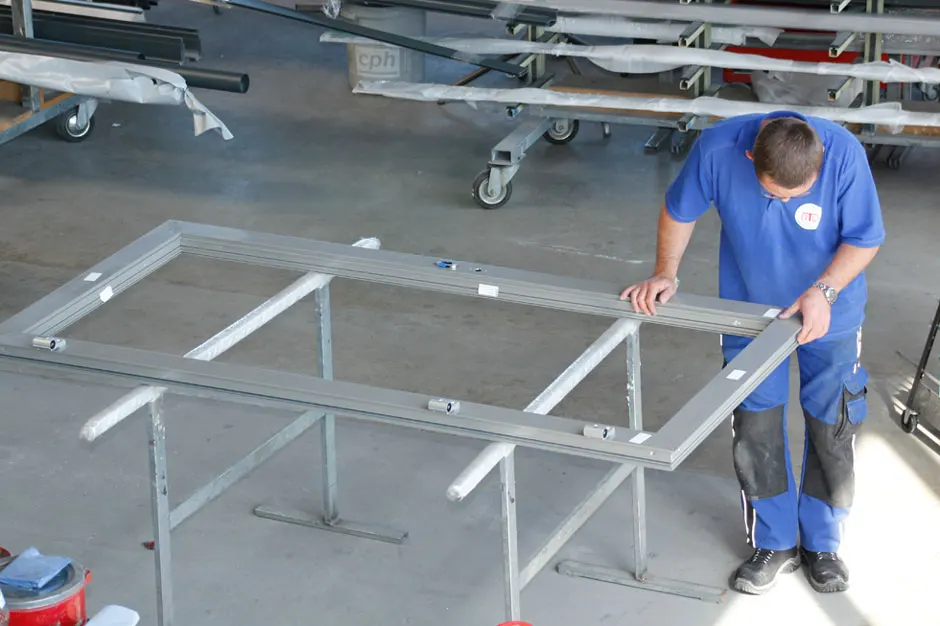 Individuelle Prozesse und höchste Präzision gehören zu den wichtigsten Eigenschaften unserer hauseigenen Fertigung. Unser gut sortiertes Lager garantiert Ihnen zu Beginn der Fertigung jederzeit die Verfügbarkeit der zu verarbeiteten Materialien wie Aluminiumprofile, Dichtung, Dacheindeckungen und sämtliche Montagematerialien.